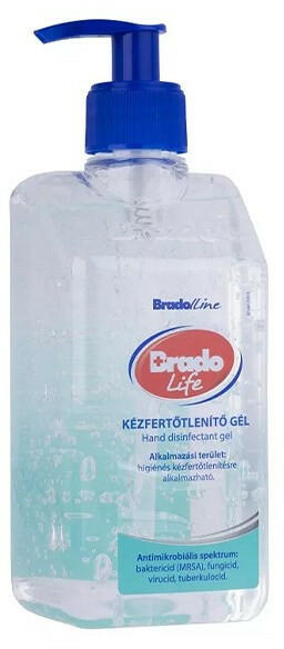 Kézfertőtlenítő gél BRADOLIFE pumpás 500ml Felhasználási terület: Higiénés kézfertőtlenítésre. Jellemzők: Széles antimikrobiális hatásspektrum. Kiváló nedvesítő képesség, víztiszta, színtelen gél. Bőrvédő adalékot tartalmaz. Nem pumpás, hanem kinyomó szelepes Alkalmazás: A készítményt töményen, higítatlanul kell alkalmazni! Az adagoló segítségével 1-2 a
