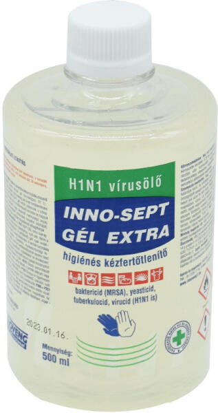 KÉZ- ÉS BŐRFERTŐTLENÍTŐ GÉL KUPAKKAL 500 ML INNO SEPT GÉL EXTRA Higiénés kézfertőtlenítő GHS piktogram: Figyelmeztetés: Veszély Figyelmeztető mondatok: H225 Fokozottan tűzveszélyes folyadék és gőz. H319 Súlyos szemirritációt okoz. Higiénés kézfertőtlenítésre, foglalkozásszerű és lakossági felhasználók részére készült gél (terméktípus: PT 1). Alkalmazhat