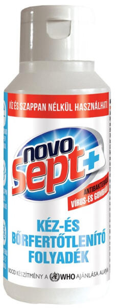 Kéz- és bőrfertőtlenítő folyadék 120 ml-es palackban visszazárható flip-top kupakkal NOVOSEPT Kiváló fertőtlenítő hatás: VIRUCID, baktericid, fungicid termék Kiváló bőrvédő hatás: Glicerint tartalmaz, így gyakori használat esetén sem szárítja a bőrt Egyszerű használat: Szappan és víz nélkül fertőtleníti a bőrt, nem igényel öblítést Kéz- és bőrfertőtlen