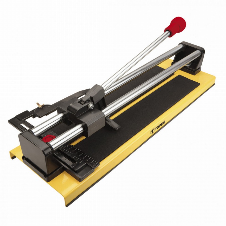 TOPEX csempevágó 22 x 10.5 x 2 mm‑es vágókéssel. Burkolási munkálatokban talál alkalmazásra. Kettős, 21 mm átmérőjű vezetőcsővel van felszerelve. A kés akadálymentes vezetését a vezetőcsöveken a beépített golyóscsapágyak biztosítják. Az alumínium asztal metrikus skálával és szögmérővel is el van látva. Külön előnye a beépített körkivágó, ami jelentőse