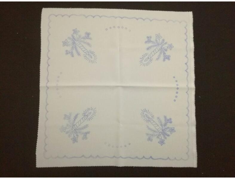 50*50 centiméteres, előrajzolt, hímezhető terítő. Az előrajzolt kézimunka a legrégebbi múltra visszatekintő, hagyományos magyar hímzésfajta.