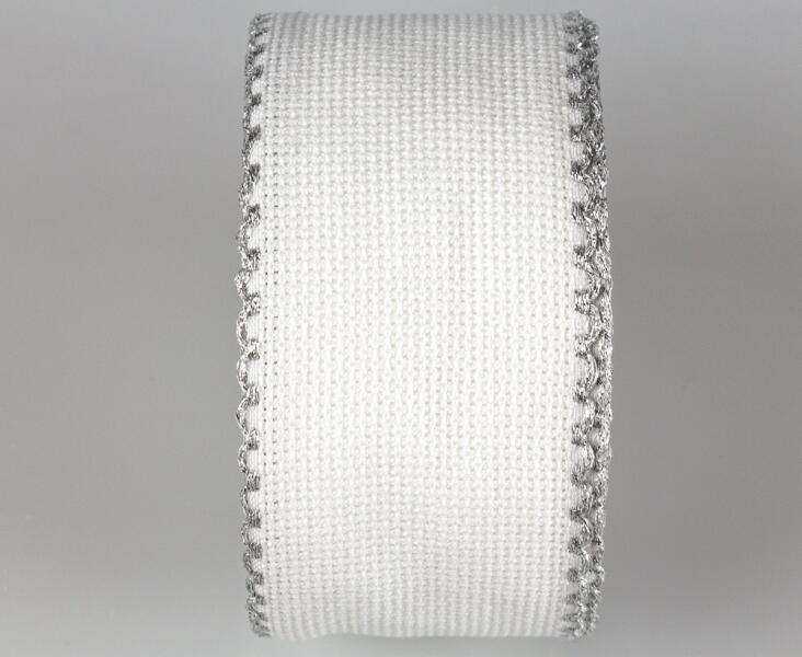 Zweigart Aida hímezhető kongré szalag Szín: fehér, ezüst szélekkel Szélesség: 50mm Anyagsűrűség: 1cm = 14 count Összetétel: 95% pamut, 5% lurex Gyártva: Németország Az ár 1m szalagra értendő.