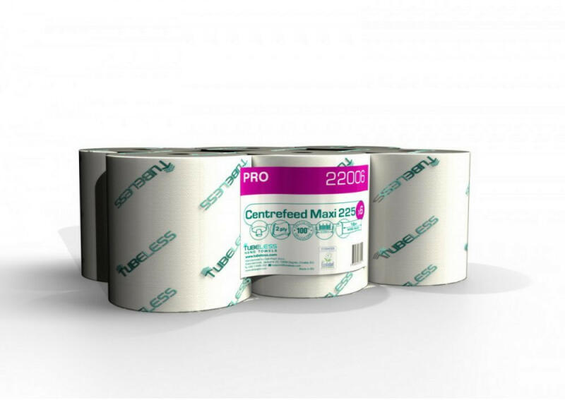 - Tubeless PRO 225 Maxi tekercses kéztörlő - 2 rétegű - 100% cellulóz - fehér - 20x25cm / lap - 912 lap / 228 méter / tekercs - 6 tekercs / zsugor - környezetbarát termék ECOLABEL címkével