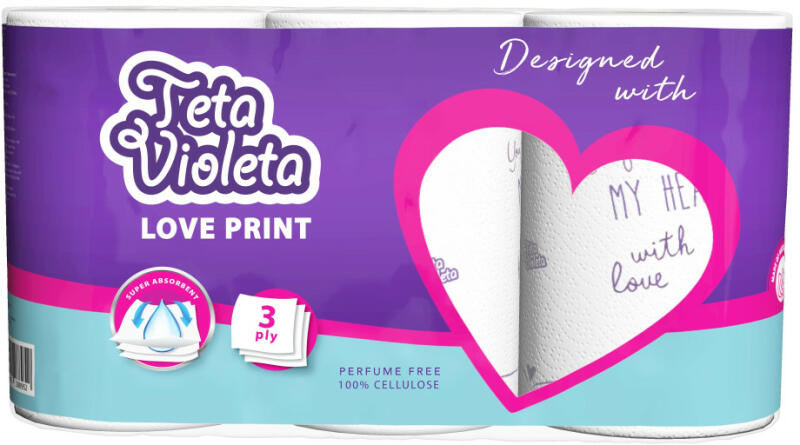 VIOLETA háztartási papírtörlő LOVE 3 rétegű, 3 tekercs - tekercses papírtörlő, konyhai papírtörlő - 3 rétegű - cellulóz - 3 tekercs/csomag - 165 lap/csomag - 7 csomag/zsák - 33 zsák/raklap