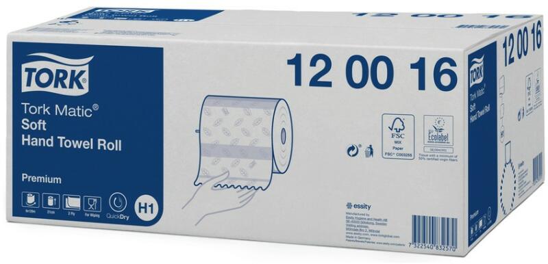 A puha, mutatós kék levélmintával, dombornyomással díszített Tork Matic® tekercses kéztörlők biztosításával javul a mosdóhelyiség minősége. A QuickDry funkciónak köszönhetően a kéztörlővel gyorsan és alaposan lehet kezet szárazra törölni. A tekercsek a Tork Matic® tekercseskéztörlő-adagolókba valók, amelyeket könnyű kezelhetőségük miatt forgalmas mosdóhelyi