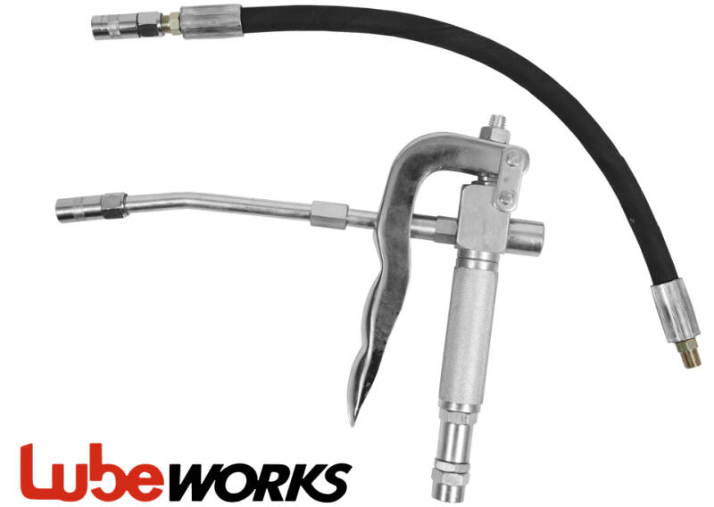 Zsírzó pisztoly: Alkalmas a hordós zsírzókészülékekhez csatlakoztatva szabályozni a zsírt. Jellemzők: Max. nyomás: 400bar Csatlakozó: 1/4" belső menetes, egyenes, forgatható recézett csúszásmentes markolat Tartozék: - 140mm-es merev, enyhén hajlított zsírzószár (belső O6mm) - 400mm-es zsírzószár (1/4", SAE100R2 belső O6mm) - zsírzó csatlakozó M10x1 vagy 1/8"NPT Hoss