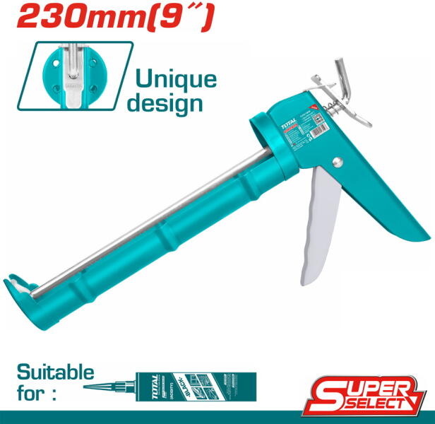 Kinyomópisztoly 230mm (THT21809) A TOTAL THT21809 tömítőanyagpisztolyt szerelési és építési munkák során alkalmazzák. Segítségével a tömítőanyagot ki lehet nyomni a patronból különböző lyukak, varratok és üregek kitöltésére. A szerszám hossza 230 mm, átmérője pedig 55 mm. A fém ház hosszú élettartamú és ellenálló mechanikai sérülésekkel szemben, így a pi