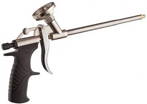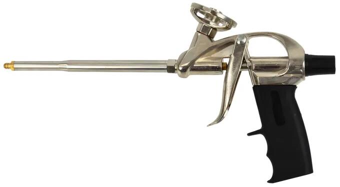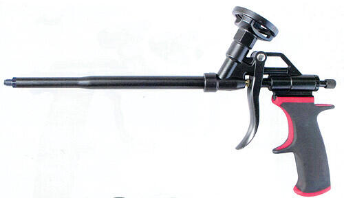 Fém pisztoly purhabhoz, pisztolyhabok kinyomására - teflongolyós, erős, masszív kivitel, teflongolyós szeleppel. Használati utasítás: Csavarjuk rá a pisztolyhab flakont a kinyomó pisztoly csatlakozó részére és a függőlegesen tartott flakonból a pisztoly