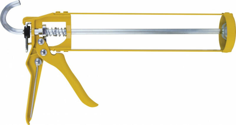 Zárt aluminium kinyomópisztoly, ajánlott tömlős kiszerelésű (nem tubusos) anyagok kinyomására Racsnis mechanizmus, egykezes fékkioldás