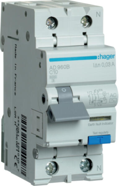 HAGER Áramvédős kismegszakító 1P+N, C-10A, 30mA, 6kA, AC (AD960B)
