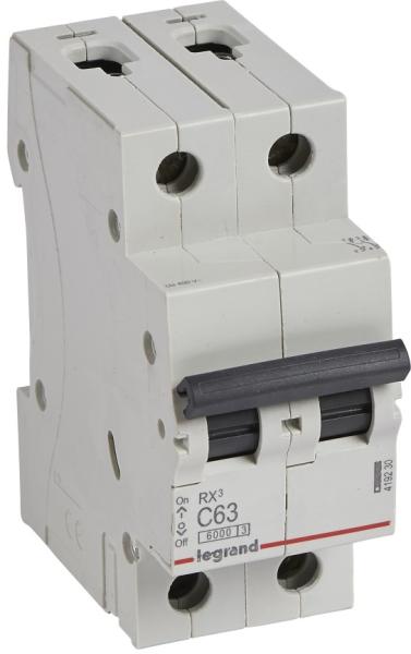 RX3 lakossági kismegszakítók 6 A és 63 A között C jelleggörbe Megfelel az IEC 60898-1 szabványnak Segédérintkezők fogadására nem alkalmas Zárlati megszakítóképesség: 6000 - IEC 60898-1 - 230/400 V~ 6 kA - IEC 60947-2 - 230/400 V~ 10000 - IEC 60898-1 - 127/220 V~ 10 kA - IEC 60947-2 - 127/220 V~ Kétpólusú 230/400 V~ C jelleggörbe Névleges áram In : 63 A 17,5 mm-es modulszám