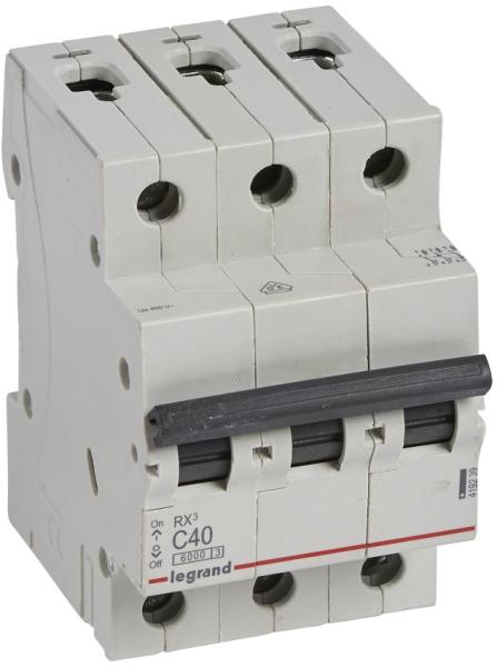RX3 lakossági kismegszakítók 6 A és 63 A között C jelleggörbe Megfelel az IEC 60898-1 szabványnak Segédérintkezők fogadására nem alkalmas Zárlati megszakítóképesség: 6000 - IEC 60898-1 - 230/400 V~ 6 kA - IEC 60947-2 - 230/400 V~ 10000 - IEC 60898-1 - 127/220 V~ 10 kA - IEC 60947-2 - 127/220 V~ Hárompólusú 400 V~ C jelleggörbe Névleges áram In : 40 A 17,5 mm-es modulszám: