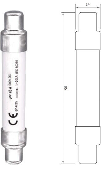 Névleges feszültség: 1500 V Névleges áram: 45 A Megszakítóképesség: 20kA Méretek (mm): 14x85