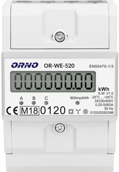 ORNO Digitális fogyasztásmérő, 3 fázisú, 80A, 230V/400V, IP51, LED, 800imp/kWh (OR-WE-520) Term kinformáció: 3 fázisú energiamérő Anyaga: műanyag Méret: 76 x 116,5 x 65 mm Készülék kWh-ban történő kijelzéshez Egy speciális elektronikus áramkör, amely az áram és az alkalmazott feszültség áramlásával impulzusokat generál az elfogyasztott energia arányában A fázis e