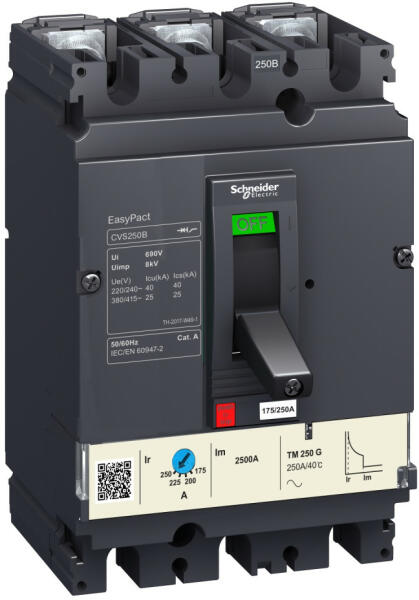 EasyPact CVS Öntött házú megszakítók 16 és 630 A között, állítható beállításokkal. Öntött házú megszakítók (MCCB) állítható beállításokkal, 16 és 630 A közötti névleges értékkel, ideálisak kis és közepes méretű épületekhez. Névleges áram 16 és 630 A között Szakító kapacitás 25 és 50 kA között 400/415 V feszültség mellett 3 és 4 pólusú változ