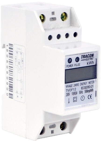 TRACON LCD kijelzésű fogyasztásmérő, közvetlen, 1 fázisú, 2 modul, 230VAC / 10(60)A (TVOF12) Termékinform áció: Számláló típusa: elektronikus Névleges áram (In): 60 A Maximális áram (Imax): 72 A Névleges feszültség (Un) N-L: 230 -230 V Frekvencia: 50 -50 Hz Pontossági osztály: B Pólustípus: 1-fázisú Kivitel: direkt Energiatípus: hatásos teljesítmény Alkalmas: vétel