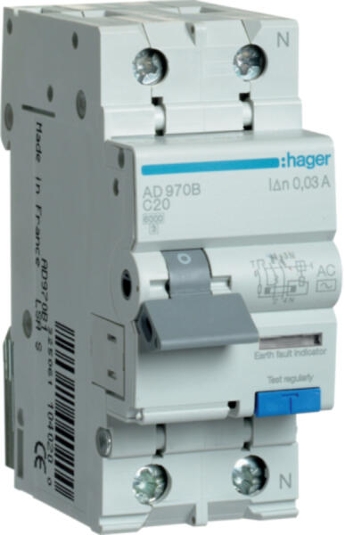 HAGER Áramvédős kismegszakító 1P+N, C-20A, 30mA, 6kA, AC (AD970B)