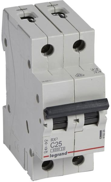 RX3 lakossági kismegszakítók 6 A és 63 A között C jelleggörbe Megfelel az IEC 60898-1 szabványnak Segédérintkezők fogadására nem alkalmas Zárlati megszakítóképesség: 6000 - IEC 60898-1 - 230/400 V~ 6 kA - IEC 60947-2 - 230/400 V~ 10000 - IEC 60898-1 - 127/220 V~ 10 kA - IEC 60947-2 - 127/220 V~ Kétpólusú 230/400 V~ C jelleggörbe Névleges áram In : 25 A 17,5 mm-es modulszám
