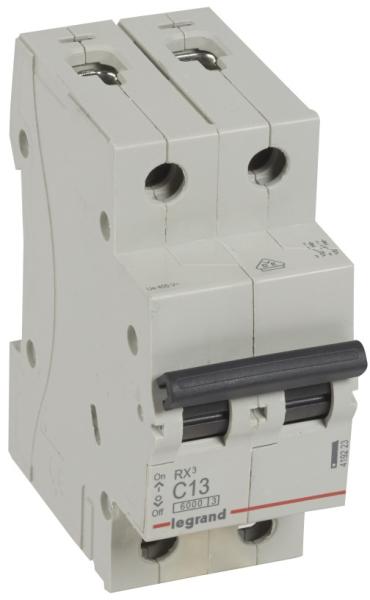 RX3 lakossági kismegszakítók 6 A és 63 A között C jelleggörbe Megfelel az IEC 60898-1 szabványnak Segédérintkezők fogadására nem alkalmas Zárlati megszakítóképesség: 6000 - IEC 60898-1 - 230/400 V~ 6 kA - IEC 60947-2 - 230/400 V~ 10000 - IEC 60898-1 - 127/220 V~ 10 kA - IEC 60947-2 - 127/220 V~ Kétpólusú 230/400 V~ C jelleggörbe Névleges áram In : 13 A 17,5 mm-es modulszám