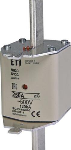 Leírás: NH3C gG 250A/500V. Tömeg: 0.58kg. Szint: NH-rendszerű (késes) olvadóbetétek (gG, ... 690V AC). Névleges áram: 250. Típus: NH. Méret: NH3. Karakterisztika: gG. Névleges feszültség AC (V): 500. Megszakítóképesség AC (kA): 120. Pd (W): 16,8.