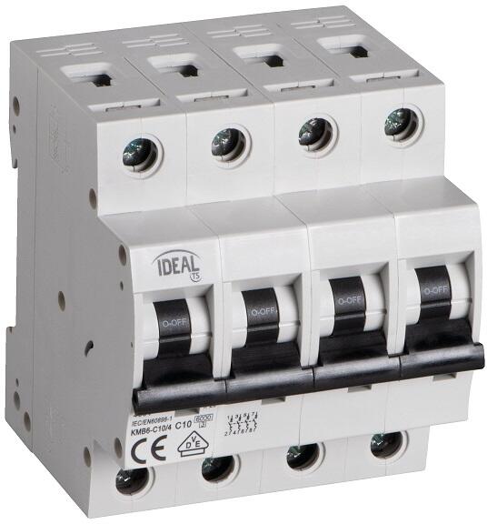 Omu system OMB06 4 pólusú 6kA kismegszakítók C karakterisztika túlterhelés, rövidzárlat elleni védelem A kismegszakító fejlett felépítésű, megbízható és nagy megszakítóképességel rendelkező eszköz. Elsősorban az 50/60Hz frekvenciájú 230/400V feszültségnél használják. Lakóépületek, irodaházak, stb. világítás, elosztószekrény és egyéb berendezések esetén