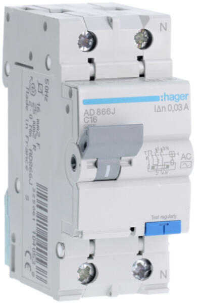 HAGER Áramvédős kismegszakító 1P+N, C-16A, 30mA, 4,5kA, AC (AD866J)