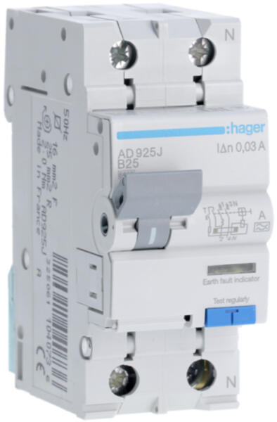 HAGER Áramvédős kismegszakító 1P+N, B-25A, 30mA, 6kA, A (AD925J)