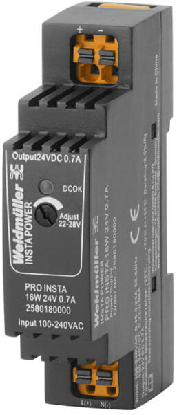 WEIDMÜLLER PRO INSTA Tápegység Moduláris 24V 16W 0,7A (2580180000) Term ékinformáció: Az egyfázisú INSTA-POWER kapcsoló tápegységeket széles teljesítmény-spektrum, kompakt kialakítás és jó árérték arány jellemzi. -25°C és +70°C közötti hőmérséklettartományban alkalmazhatóak, nemzetközi jóváhagyással, és széles bemenő feszültség-tartománnyal rendelkeznek.