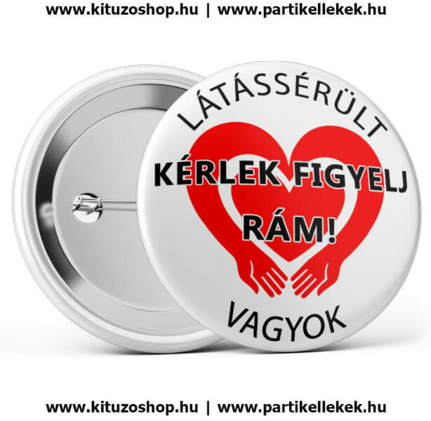 Látássérült vagyok feliratos, mintás kitűző Látássérült vagyok feliratos, mintás kitűző. Figyeljünk a hallássérült emberekre, különösen a gyerekekre, hiszen életük más jellegű, figyelmet igénylő. Tegyük életüket könnyebbé, segítsük őket, ahol tudjuk. Anyaga: fém Hátlap: tűs Mérete: 58mm
