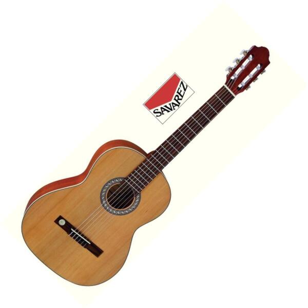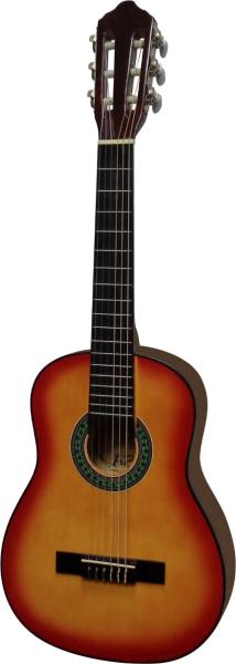 Balkezes Német klasszikus gitár Méret: 1/4, 31" Hossza: 78,5 cm Nyakszélesség: 41,5 mm Menzúra: 48,5 cm Nylon húrokkal Test: vörösesbarna furnérozott hársfa Széle: barna hársfa Ezüstös bundok Fényes lakkozású