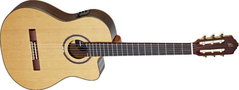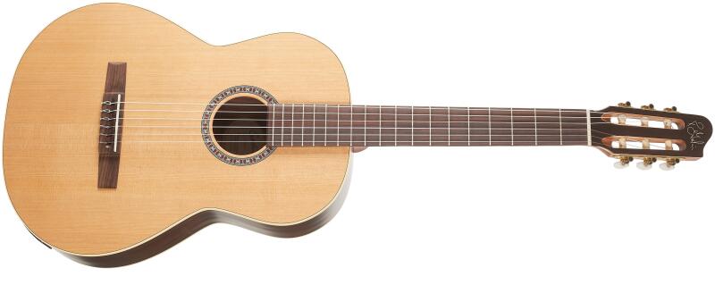 Elektro-klasszikus gitár, fenyő fedlap, klasszikus cutaway forma Konstrukció: klasszikus testforma, velencei cutaway, dovetail nyakcsatolakozás Fedlap: fenyő Hát- és oldallap: mahagóni Menzúra: 25.3" (643 mm) Nyak: mahagóni Pálca: 2 irányba állítható Fogólap: rózsafa Nyak csatlakozása a testhez: 14. bundnál Berakás: fehér akril levelek a fejen, fehér-gyöngyház akril a hangl