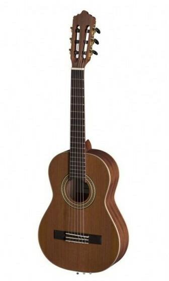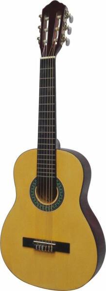 Német klasszikus gitár Méret: 3/4, 36" Hossza: 92,5 cm Nyakszélesség: 45 mm Menzúra: 58,5 cm Aranysárga masszív tengelymehanika Nylon húrokkal Fedőlap: fényes natur furnérozott lucfenyő Test: Barna hársfa Szél: Barna árnyalatú hársfa Fogólap és híd: fekete dió Szín: Sötét natur Fényes lakkozású D'Addario húrokkal