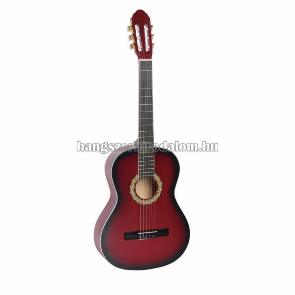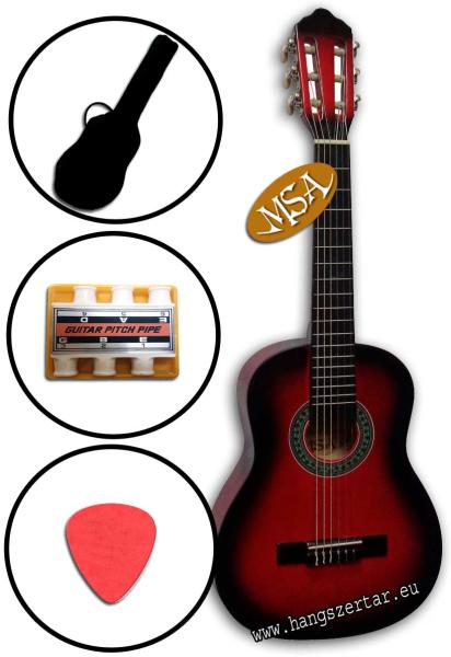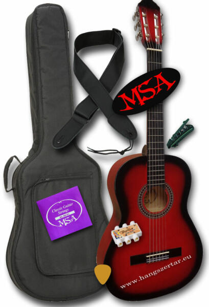 MSA C-11 7/8-os Német klasszikus gitár Méret: 7/8, 38" Hossza: 97 cm Nyakszélesség: 44 mm Menzúra: 62 cm Nylon húrokkal Test: bordó furnérozott lucfenyõ Széle: fekete hársfa Fényes lakkozású