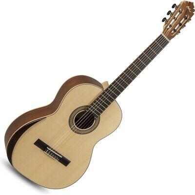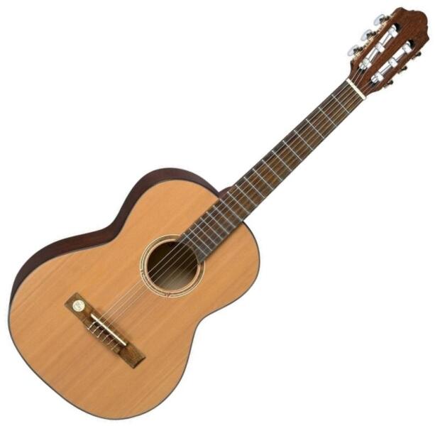 1/2-es méretű klasszikus gitár Test:Nato Fedlap: Sitka fenyő Nyak: Jabon Fogólap: Ebonizált mahagony Húrláb műanyag alső nyereggel, fekete ABS kötés, Bund: 19 sárgaréz