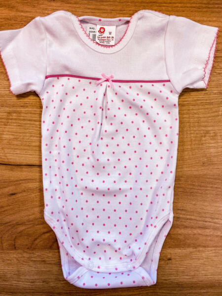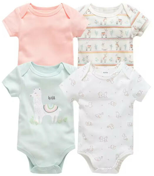 Foxy Baby Rövid ujjú pamut body szett (4db-os) 3-6 hónapos kor között 5.7-7.5 kg 61-67 cm A bodyk alapvető ruhadarabok, a szett 4 db különböző színű és mintájú bodyt tartalmaz, így minden babaruhához jól kombinálható. A body 100% pamut, nem irritálja a baba finom bőrét. Mosás: Max. 40 fokon mosható Vegyileg nem tiszítható és nem ferhéríthető Szárítógépben szárí