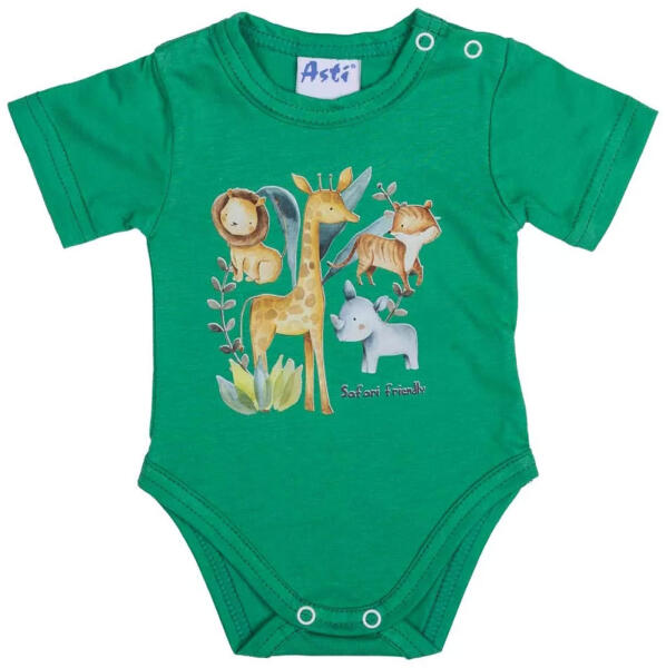 A zöld színű, rövid ujjú baba body vagány szafaris mintával varázsolja még édesebbé kisbabáját. A vidám szafaris minta garantáltan mosolyt csal az arcára minden kisgyermeknek és szülőnek egyaránt. Kiváló választás lehet mindennapi viseletként, hiszen könnyen kombinálható más ruhadarabokkal. Méretek: 68 Anyaga: 100% pamut Minőség: I. osztály A termék nikkelmentes p