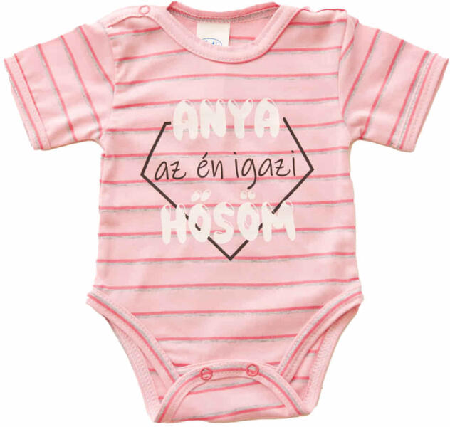 Öltöztesd a kisbabádat ebbe a csodálatos rózsaszín csíkos, rövid ujjú bodyba, melyen a "Anya az én igazi hősöm" felirat hirdeti szeretetedet a világ felé! A body vállánál mindkét oldalon, illetve alul dupla patenttal rendelkezik, így könnyedén igazíthatod a méretet a baba növekedéséhez. Készült 100% pamutból, így extra puha és kényelmes viseletet biztosít a kicsikn