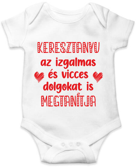 RAKTÁRRÓL AZONNAL! A cégünk által gyártott babaruhák közül kiemelkedik a vicces, feliratos baba body , mely magas minőségű termék , teljes körű garanciával. Anyaga 100% pamut ból készül, nikkel mentes patentek kel van ellátva, így teljesen bőrbarát, mert nem irritálja a baba bőrét . A felirat a kényelmes magyar termékünkön nem csak szép, de használat közben is tart