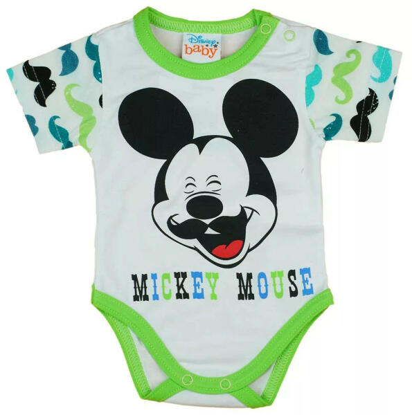 Rövid ujjú baba body bajszos Mickey egér mintával Eredeti Disney termék Rövid ujjú baba body vidám bajszos Mickey egér mintával könnyű, nyári 100% pamut bababarát anyagból. Vállán patentos, így megkönnyíti az öltöztetést. A lába közötti patentos megoldás pedig a peluscserét gyorsítja meg. Minőségi, könnyen kezelhető, jól mosható anyagból készült. Minőségi ma