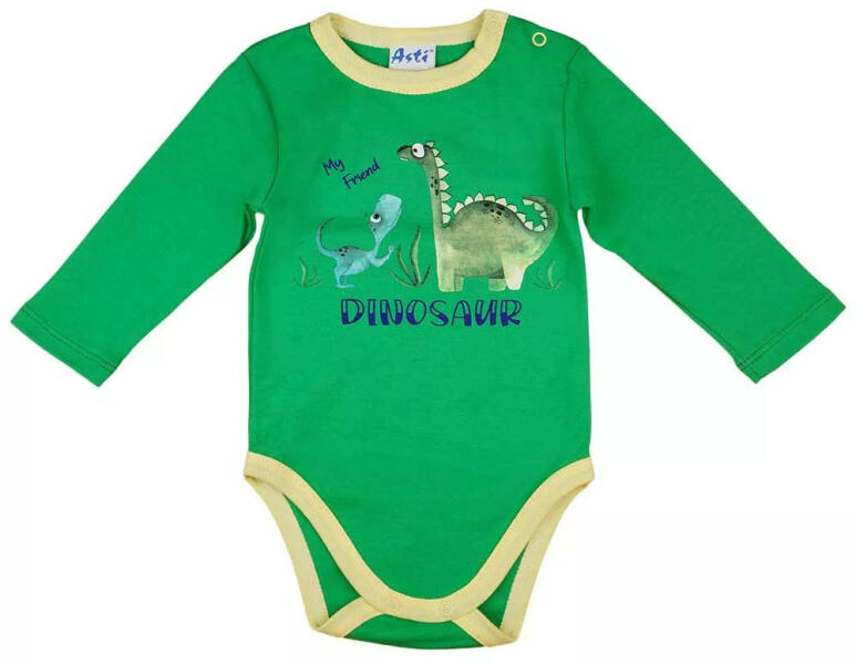 Hosszú ujjú kisfiú baba body dinoszaurusz mintával Igazán fiús ez a dinoszaurusz mintával nyomott baba body. 100% pamut anyagának köszönhetően kényelmes viselet kisbabánknak akár egész napra. Vállán patentos így könnyen le és feladható. Könnyen kezelhető, jól mosható, szín és forma tartó. Minőségi anyagból. Minőségi magyar termék Anyaga: 100% pamut Minőség: I. o