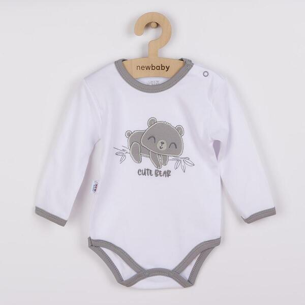 Cuki, hosszú ujjú body kisbabák számára a New Baby Cute Bear kollekcióból. A bodyn egy hímzett mackó kép található, amelyet egy védő textilréteg borít, így megakadályozza, hogy a baba megkarcolja magát. A vállaknál és az ülepénél patentos megoldással rendelkezik, ami megkönnyíti az öltöztetést és a pelenkázást. A nyak, a szárak és az ujjak szegéllyel vannak ell