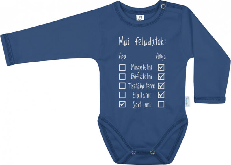 RAKTÁRRÓL AZONNAL! A cégünk által gyártott babaruhák közül kiemelkedik a vicces, feliratos baba body , mely magas minőségű termék , teljes körű garanciával. Anyaga 100% pamut ból készül, nikkel mentes patentek kel van ellátva, így teljesen bőrbarát, mert nem irritálja a baba bőrét . A felirat a kényelmes magyar termékünkön nem csak szép, de használat közben is tart