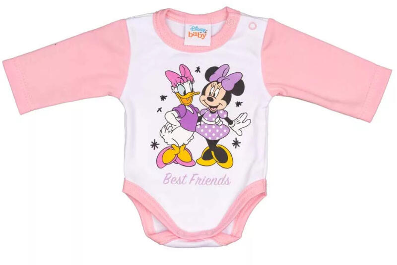 Disney Minnie mintával nyomott hosszú ujjú baba body A Disney Minnie mintával nyomott hosszú ujjú baba body a kisbabák ruhatárának praktikus, nélkülözhetetlen kelléke. A bodyt egy aranyos Minnie minta díszíti, ami garantáltan elvarázsol minden kis Disney rajongót. A 100% pamutból készült body nem csak kényelmes és puha viseletet biztosít, de szín- és formatartó anyagána