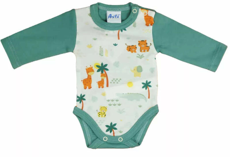 Hosszú ujjú baba body zsafaris mintával Kisbabák ruhatárának praktikus alapdarabja a body. Ez a cuki szafaris mintával nyomott baba body minőségi, bababarát 100% pamut anyagból készült, szín- és formatartó anyagból, ami jól bírja a gyakori mosást is. Vállán patentos, így megkönnyíti a baba öltöztetését. A lába közötti patentos megoldás, pedig a gyors peluscserét t