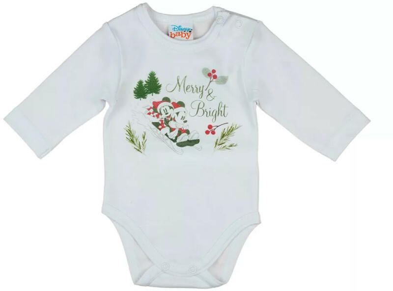 Disney Mickey és Minnie karácsonyi hosszú ujjú baba bodyEredeti Disney termékMickey és Minnie karácsonyi mintával nyomott, vállon patentos, hosszú ujjú baba body, kombidressz. Minőségi magyar termék Anyaga: 100% pamutMinőség: I. osztályA termék nikkelmentes patenttal készül. A patent nem tartalmaz nikkelt, ezért nem vált ki allergiás reakciót az erre érzékeny babáknál.