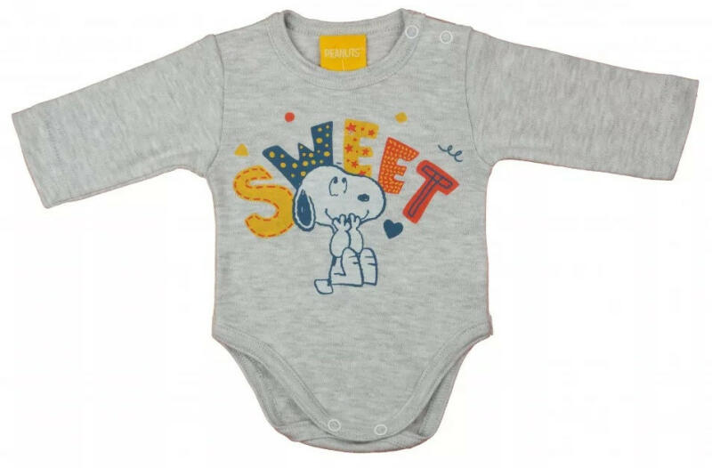 Hosszú ujjú baba body Snoopy mintával Kisbabák ruhatárának praktikus alapdarabja a body. Ez a cuki Snoopy mintával nyomott baba body minőségi, bababarát 100% pamut anyagból készült, szín- és formatartó anyagból, ami jól bírja a gyakori mosást is. Vállán patentos, így megkönnyíti a baba öltöztetését. A lába közötti patentos megoldás, pedig a gyors peluscserét teszi