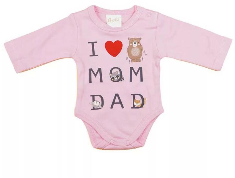 Feliratos hosszú ujjú baba body Kisbabák ruhatárának praktikus alapdarabja a body. "I love mom dad " felirattal nyomott baba body minőségi, bababarát 100% pamut anyagból készült, szín- és formatartó anyagból, ami jól bírja a gyakori mosást is. Vállán patentos, így megkönnyíti a baba öltöztetését. A lába közötti patentos megoldás, pedig a gyors peluscserét teszi lehe