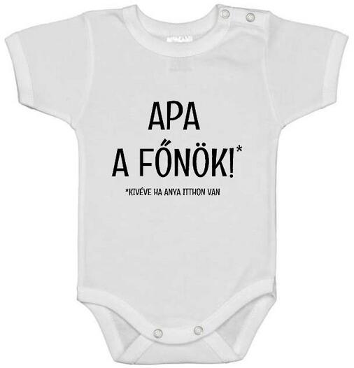 Baby body Apa a főnök (kivéve ha anya itthon van) felirattal. Méret50-56, 62-68, 74-80, 86-92SzínFehérAnyag100% Pamut