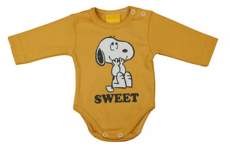Hosszú ujjú baba body Snoopy mintával Kisbabák ruhatárának praktikus alapdarabja a body. Ez a cuki Snoopy mintával nyomott baba body minőségi, bababarát 100% pamut anyagból készült, szín- és formatartó anyagból, ami jól bírja a gyakori mosást is. Vállán patentos, így megkönnyíti a baba öltöztetését. A lába közötti patentos megoldás, pedig a gyors peluscserét teszi