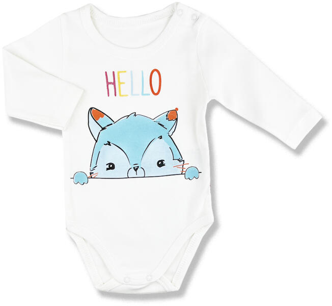 Hosszú ujjú baba body zsiráf mintával Kisbabák ruhatárának praktikus alapdarabja a body. Ez a cuki zsiraf mintával nyomott baba body minőségi, bababarát 100% pamut anyagból készült, szín- és formatartó anyagból, ami jól bírja a gyakori mosást is. Vállán patentos, így megkönnyíti a baba öltöztetését. A lába közötti patentos megoldás, pedig a gyors peluscserét tesz